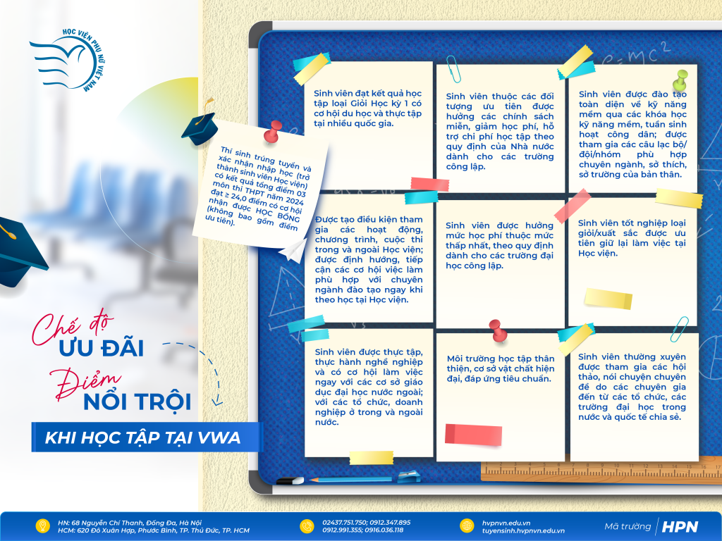 Một trong những chính sách ưu đãi nổi bật được áp dụng từ nhiều năm nay của Học viện Phụ nữ Việt Nam dành cho tân sinh viên là: Những thí sinh trúng tuyển và xác nhận nhập học (trở thành sinh viên Học viện) có kết quả tổng điểm 03 môn thi THPT năm 2024 đạt ≥ 24,0 điểm có cơ hội nhận được HỌC BỔNG (không bao gồm điểm ưu tiên).