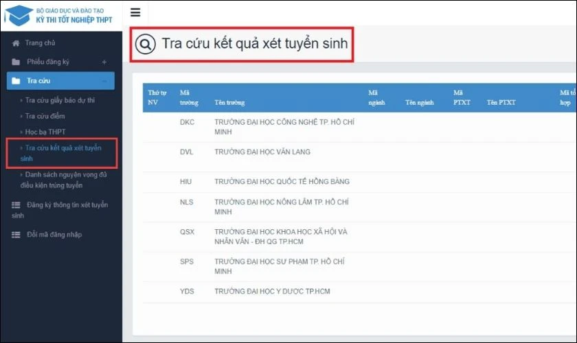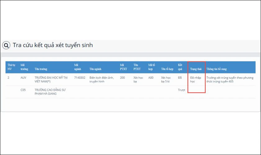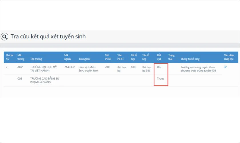 Tại mục tra cứu, hệ thống sẽ hiển thị các nguyện vọng đã đăng ký và kết quả trúng tuyển tương ứng. Những nguyện vọng có kết quả ‘Trúng tuyển’ sẽ được ghi chú rõ ràng.