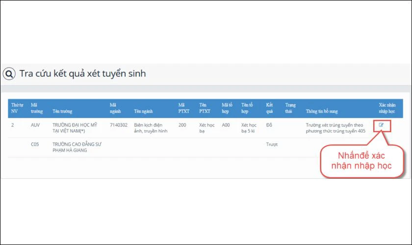 Ngay cạnh nguyện vọng trúng tuyển, hệ thống sẽ hiển thị biểu tượng Xác nhận. Thí sinh cần nhấn vào biểu tượng này để bắt đầu quy trình xác nhận nhập học.
