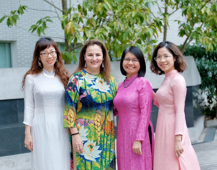 Trưởng Văn phòng UN Women tại Việt Nam Elisa Fernandez Saenz (thứ 2 từ trái sang) cùng các nhân viên mặc áo dài