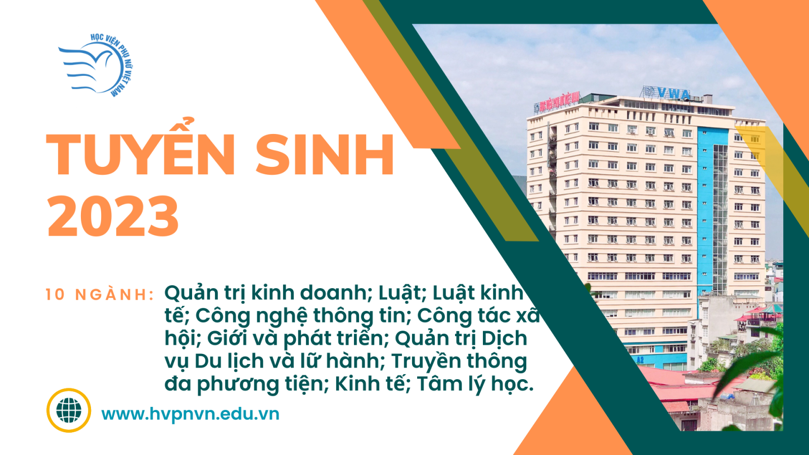 Học viện Phụ nữ Việt Nam (Học viện) là cơ sở giáo dục đại học công lập đạt chuẩn kiểm định chất lượng giáo dục quốc gia. Năm 2023, Học viện Phụ nữ Việt Nam thông báo tuyển sinh 10 ngành đại học chính quy bao gồm: Ngành Quản trị kinh doanh; Luật; Luật kinh tế; Công nghệ thông tin; Công tác xã hội; Giới và phát triển; Quản trị Dịch vụ Du lịch và lữ hành; Truyền thông đa phương tiện; Kinh tế; Tâm lý học.