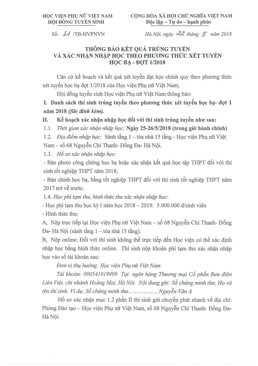 Tin tứcDANH SÁCH THÍ SINH TRÚNG TUYỂN ĐỢT I NĂM 2018 (Theo hình thức xét học bạ) Posted on Tháng Năm 22, 2018 by admin(full) 22 Th5 Mời bạn đọc xem Danh sách thí sinh trúng tuyển đợt I theo hình thức xét học bạ TẠI ĐÂY admin(full) Học viện Phụ nữ Việt Nam công bố danh sách trúng tuyển đại học chính quy đợt I 2018 Đảng bộ Học viện Phụ nữ Việt Nam tổ chức hội nghị sinh hoạt chuyên đề