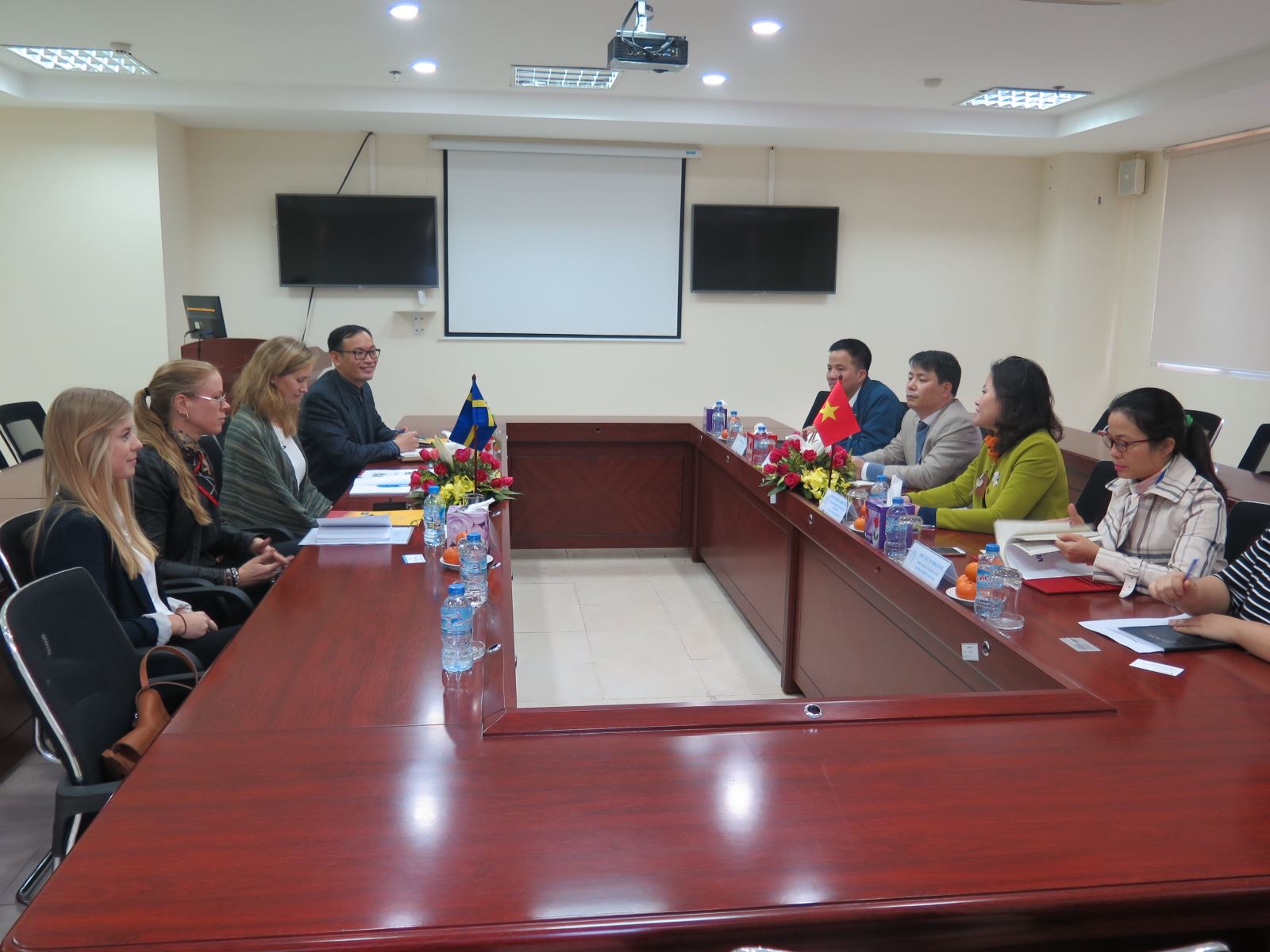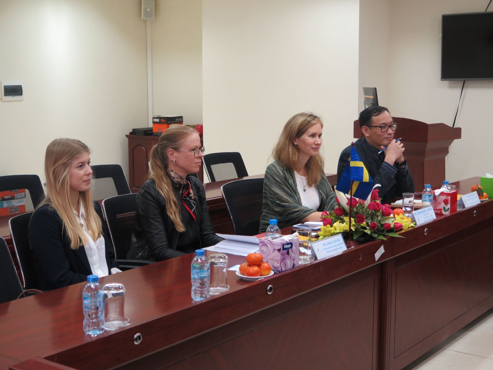 TS. Trần Quang Tiến, Giám đốc Học viện và lãnh đạo các khoa, phòng đã đón tiếp bà Victoria Rhodin Sandström, Bí thư thứ nhất, Trưởng ban Chính trị; bà Camilla Bjekkas, phụ trách văn hóa và xúc tiến hình ảnh Thụy Điển; ông Phạm Tùng Lâm, cố vấn báo chí, truyền thông và chính trị Đại sứ quán Thụy Điển.
