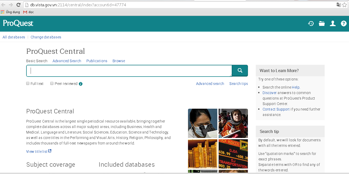 Proquest Central là bộ cơ sở dữ liệu lớn bao gồm 25 cơ sở dữ liệu đa ngành, xử lý trên 19.000 tạp chí, trong đó hơn 13.000 tạp chí toàn văn. Dữ liệu của Proquest Central bao quát trên 160 lĩnh vực chủ đề khác nhau thuộc các ngành khoa học nòng cốt như: Kinh tế – kinh doanh, Y học, Công nghệ, Khoa học xã hội…Ngoài ra, Proquest Central còn cung cấp toàn văn của 56.000 luận văn trong các lĩnh vực tâm lý học, kinh doanh, khoa học vật lý, y tế, giáo dục…và đưa ra các thông tin cô đọng về kinh tế, kinh doanh thông qua các báo cáo từ hàng trăm ngành công nghiệp tại 90 quốc gia, cung cấp 43.000 hồ sơ doanh nghiệp, thu thập trên 1.000 tài liệu hội nghị và 1.300 tờ báo quốc tế, bao gồm cả những tờ báo hàng đầu của Mỹ như The Wall Street Journal…