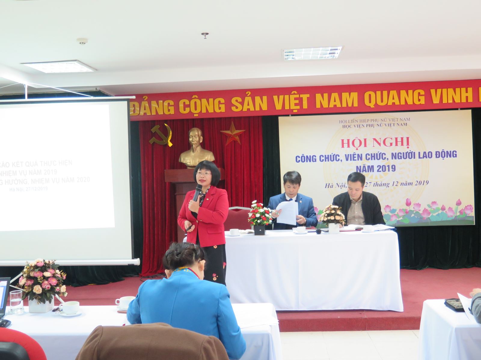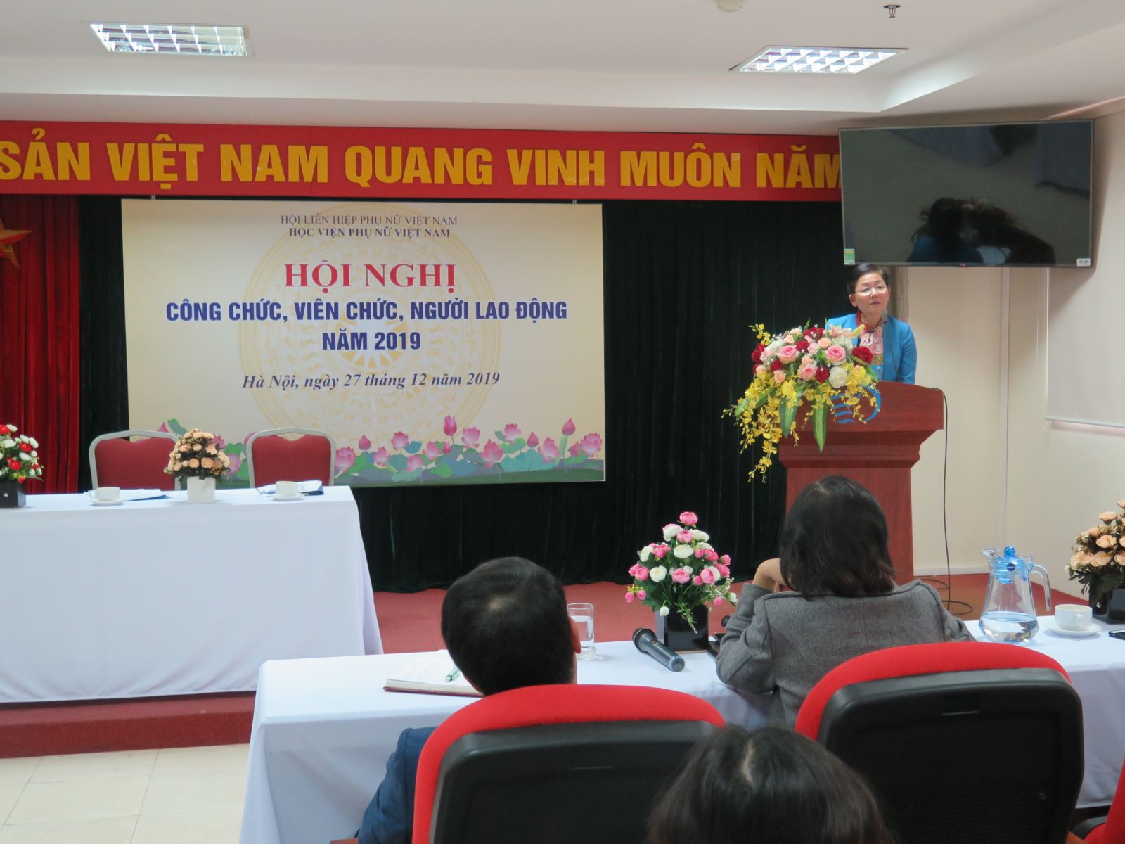 Phát biểu tại hội nghị, đồng chí Trần Thị Hương đánh giá cao những nỗ lực trong chỉ đạo, điều hành, tổ chức công việc của Ban Giám đốc; sự đoàn kết, trách nhiệm, tận tâm của đội ngũ quản lý các đơn vị và viên chức, người lao động toàn Học viện; ghi nhận và biểu dương các kết quả đã đạt được về đào tạo, bồi dưỡng, nghiên cứu khoa học và quản trị, vận hành phát triển tổ chức của Học viện, nhất là những điểm nổi bật năm 2019 đã được thể hiện trong báo cáo tổng kết; đề nghị Học viện tiếp tục phát huy những điểm mạnh, hạn chế điểm yếu và sáng tạo nhiều hơn các giải pháp vượt qua khó khăn, thách thức để nâng cao chất lượng, hiệu quả các mặt công tác, đạt nhiều thành công hơn trong năm tới; đề nghị Ban Giám đốc tập trung trí tuệ chỉ đạo, hướng dẫn, kiểm tra việc thực hiện các hoạt động trọng tâm đã xác định, trong đó cần chú trọng việc hoàn thiện và trình Thường trực Đoàn Chủ tịch phê duyệt Quy chế tổ chức và hoạt động của Học viện phù hợp với tình hình mới và định hướng của Hội, trong đó làm rõ vị thế của Phân hiệu theo Luật Giáo dục Đại học, trên cơ sở đó, xúc tiến việc điều chỉnh Kế hoạch Chiến lược giai đoạn 2021 – 2030; tăng cường các biện pháp bảo đảm chất lượng đào tạo, bồi dưỡng; đánh giá đúng, kịp thời và sát thực tế để có hình thức hỗ trợ sinh viên nâng cao chất lượng học tập theo hướng tích lũy năng lực làm việc; nghiên cứu cách thức đổi mới đánh giá học lực của sinh viên một số môn học từ kiểm tra kiến thức đơn thuần sang đánh năng lực thực tế thông qua tiểu luận, đề án, giải pháp phù hợp với ngành đào tạo; sử dụng có hiệu quả các kết quả nghiên cứu khoa học, các bài viết của giảng viên, nghiên cứu viên đã đăng trên Báo, Tạp chí chuyên ngành; kiến nghị, đề xuất những giải pháp phù hợp với chức năng nhiệm vụ của Hội để Đoàn Chủ tịch có thêm cơ sở lý luận, thực tiễn phục vụ các quyết định lãnh đạo, chỉ đạo phong trào và các hoạt động Hội, nhất là những vấn đề liên quan đến nâng cao năng lực cán bộ Hội các cấp, đáp ứng việc vận hành các hoạt động Hội có chất lượng và hiệu quả; vận hành có hiệu quả cơ sở vật chất hiện có, đẩy nhanh các hoạt động phát triển trụ sở của Học viện; nghiên cứu, đề xuất cơ chế với Hội về việc cải tạo nhà 3 tầng để bảo đảm an toàn, mỹ quan và cảnh quan cho Học viện. Tiếp tục đẩy mạnh các hoạt động hợp tác quốc tế, khai thác nguồn lực; quản trị thông tin, dữ liệu, học liệu ở tầm cao hơn; nâng cao năng lực tham mưu, tổ chức công việc cho viên chức phù hợp với nhiệm vụ thực tế theo vị trí việc làm.