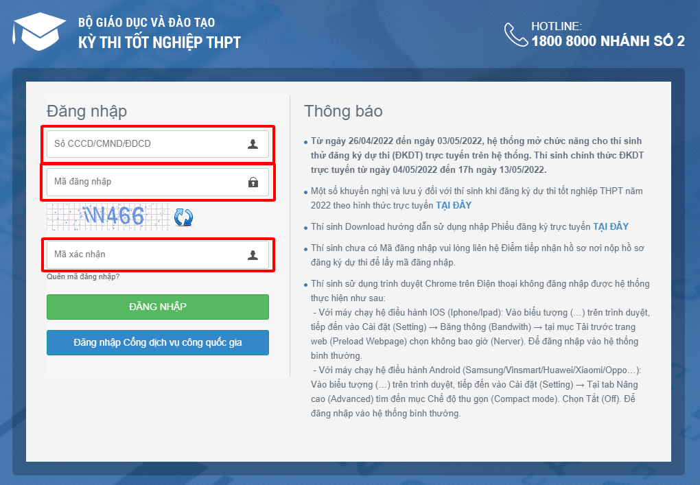 BƯỚC 1: THÍ SINH TRUY CẬP VÀ ĐĂNG NHẬP VÀO HỆ THỐNG CỦA BỘ GIÁO DỤC VÀ ĐÀO TẠO: http://thisinh.thitotnghiepthpt.edu.vn/