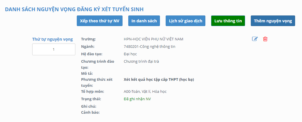 Sau khi nhấn “Chọn” tại phần Danh sách nguyện vọng đăng ký xét tuyển sinh sẽ hiển thị thông tin nguyên vọng thí sinh vừa đăng ký.