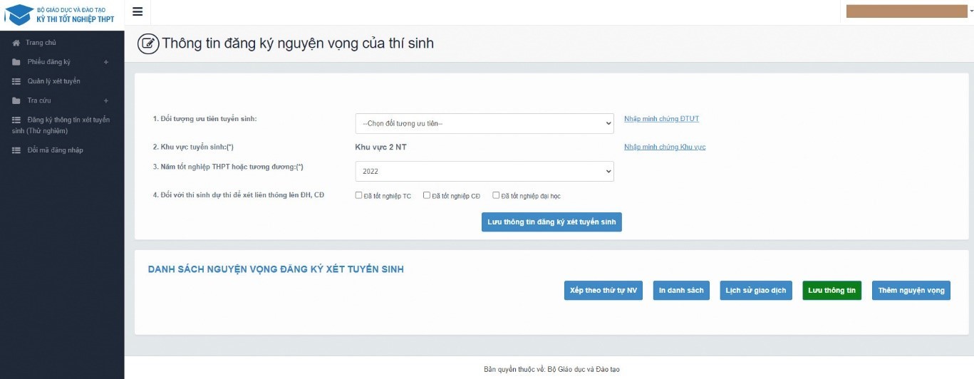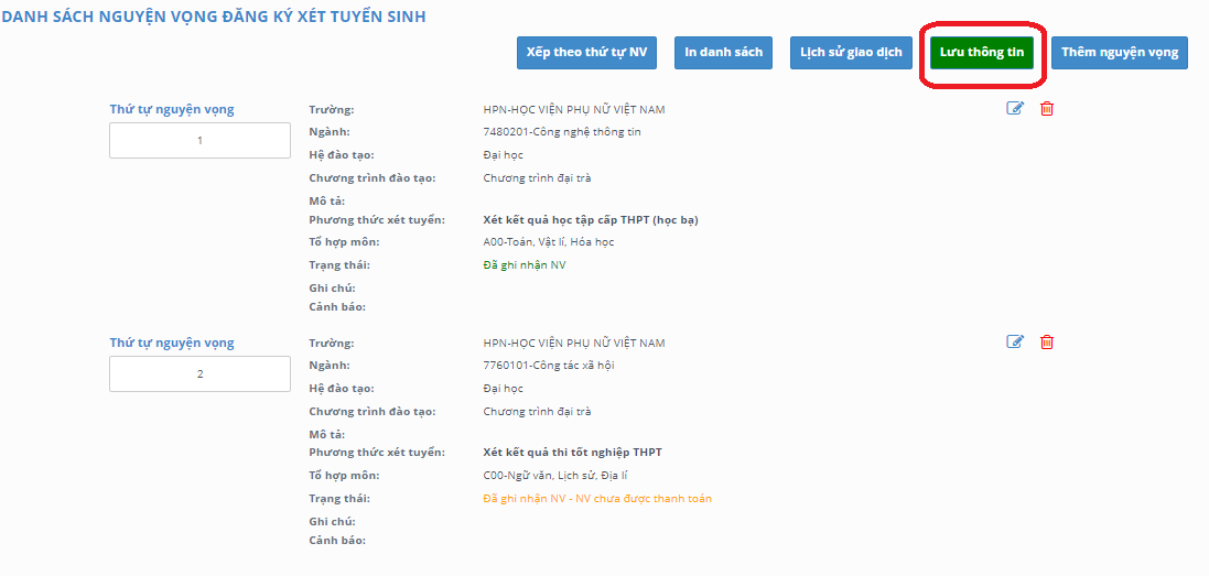 Sau khi thí sinh đã nhập đầy đủ nguyện vọng muốn đăng ký, thí sinh thực hiện “Lưu thông tin”.