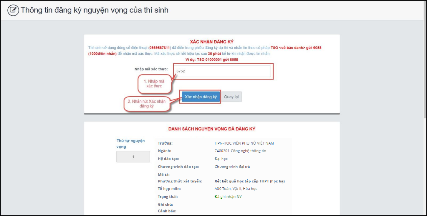 Khi nhận được mã xác thực trên điện thoại, thí sinh nhập mã vào ô “Nhập mã xác thực” và nhấn chọn “Xác nhận đăng ký”.