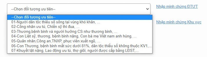 – Nếu thí sinh không thuộc đối tượng ưu tiên nào thì thí sinh chọn dòng đầu tiên “–Chọn đối tượng ưu tiên–‘.