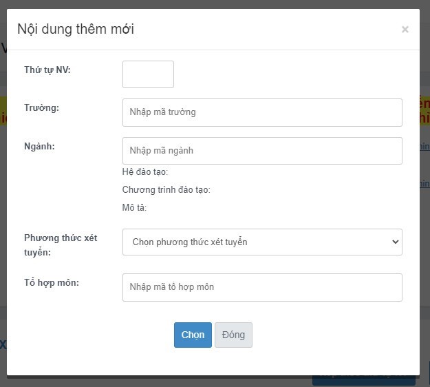 Sau khi nhấn chọn “Thêm nguyện vọng” màn hình sẽ hiển thị cửa sổ như sau:
