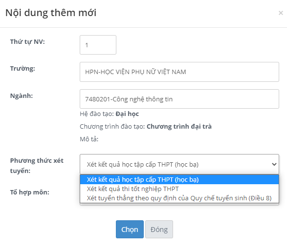 – Phương thức xét tuyển: Thí sinh chọn phương thức xét tuyển phù hợp (Ví dụ như hình bên dưới).