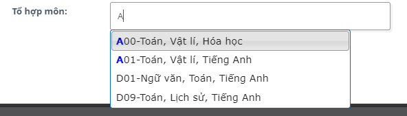 – Tổ hợp môn: Thí sinh nhập tổ hợp môn tương ứng với ngành và phương thức xét tuyển (Ví dụ: A00-Toán, Vật lí, Hóa học).