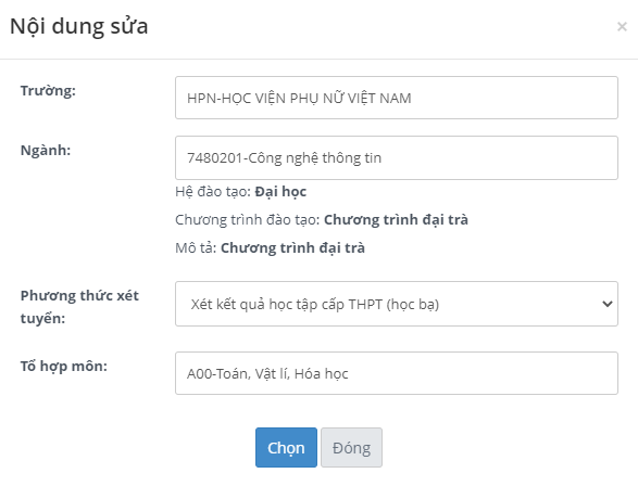 – Trường: Thí sinh nhập mã trường đăng ký nguyện vọng (Ví dụ: HPN-HỌC VIỆN PHỤ NỮ VIỆT NAM)