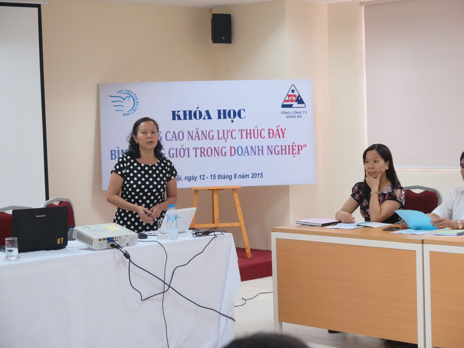 Để hiện thực hóa mong muốn của Tổng công ty Sông Đà trong việc tổ chức khóa học nhằm nâng cao nhận thức giới cho đội ngũ cán bộ chủ chốt, cung cấp cho họ một số kiến thức, kỹ năng quan trọng về giới, góp phần nâng cao hiệu quả kinh doanh sản xuất, Bộ môn Giới và Phát triển, Học viện Phụ nữ Việt Nam đã thiết kế khóa học với 4 nhóm nội dung chính: (1) Kiến thức cơ bản về Giới trong Doanh nghiệp; (2) Kỹ năng Phân tích Giới trong Doanh nghiệp; (3) Kỹ năng Lồng ghép Giới trong Doanh nghiệp; (4) Bộ nguyên tắc trao quyền cho phụ nữ tại Doanh nghiệp và ứng dụng thực tế.