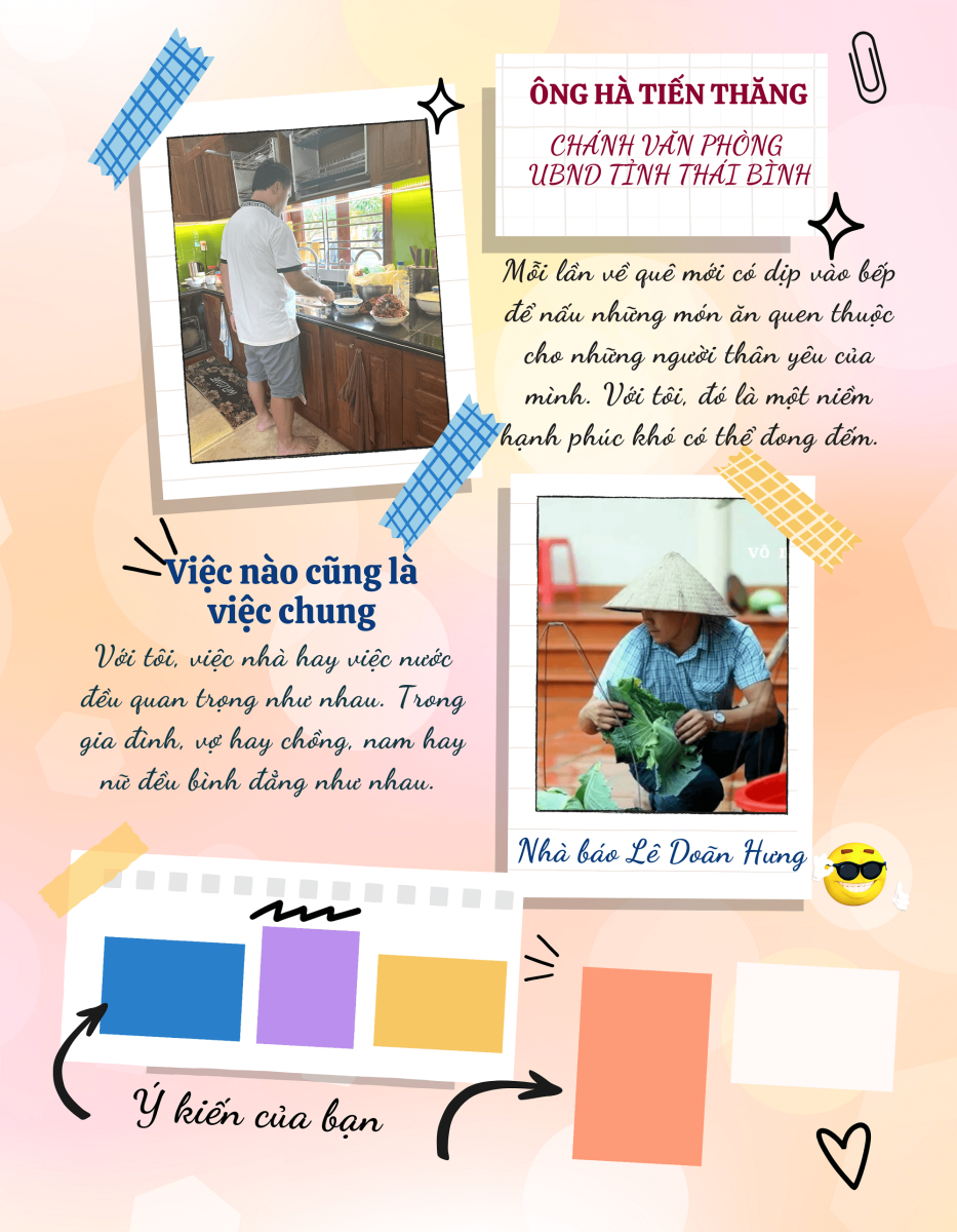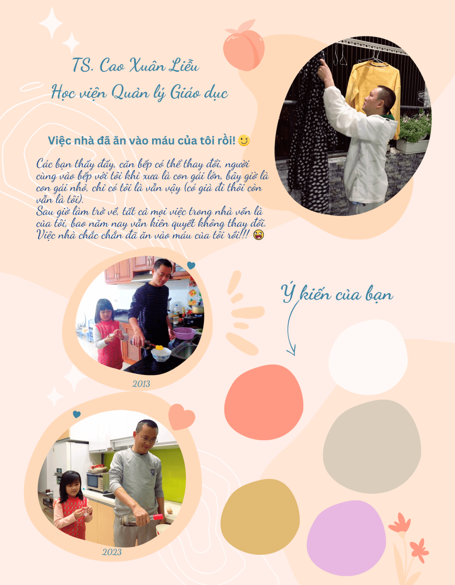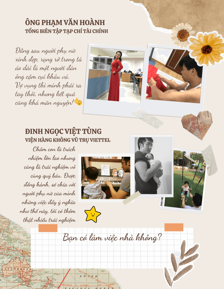 Trong quá trình thực hiện dự án, nhóm đã trao đổi, tìm hiểu thông tin của các nhân vật ở nhiều vị trí khác nhau trong xã hội về vấn đề làm việc nhà. Dưới đây là những chia sẻ của các nhân vật là giảng viên, nhà quản lý, Chủ doanh nghiệp, nông dân, nhà báo…về vấn đề việc nhà: