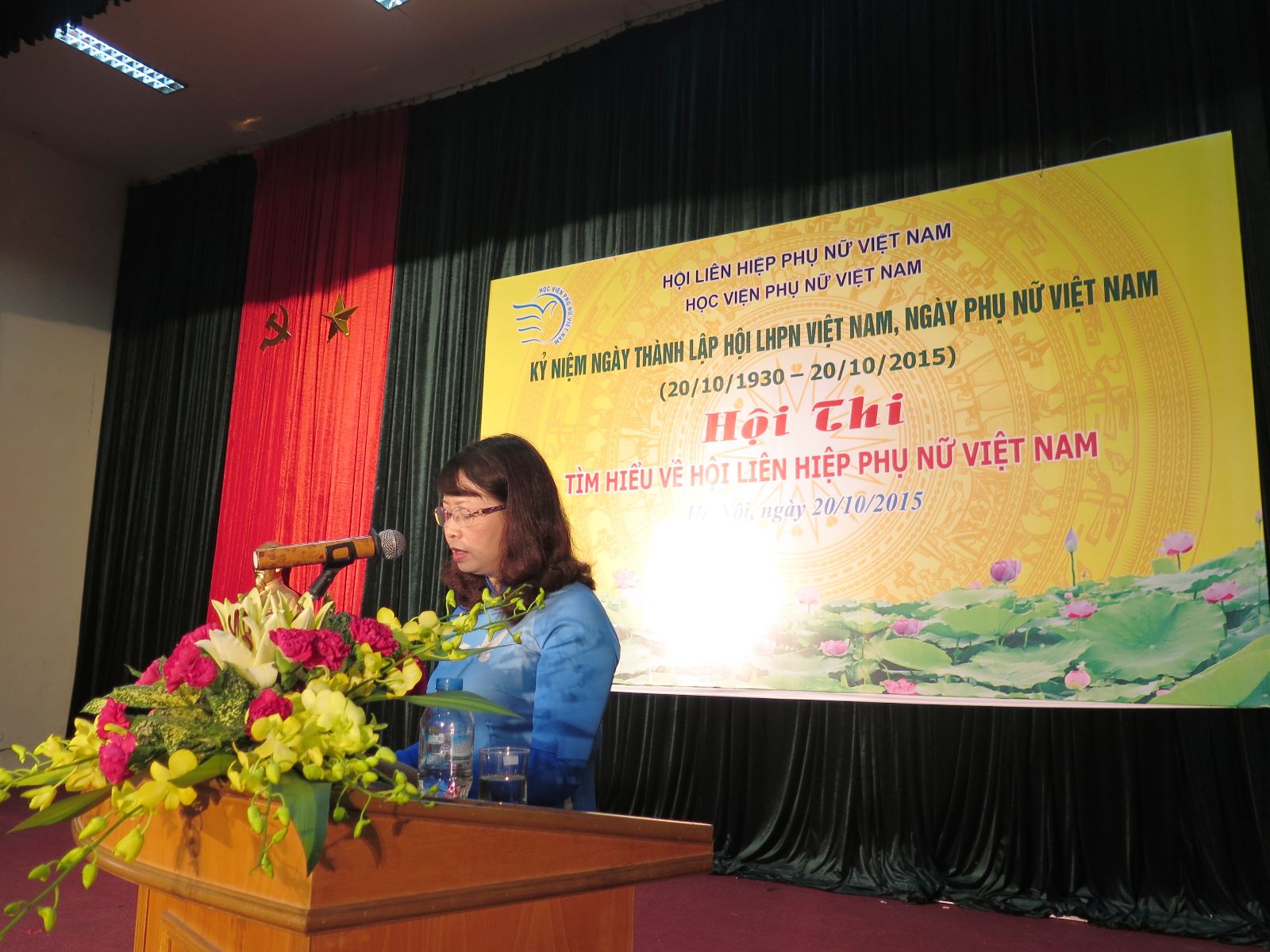 Mở đầu chương trình, TS. Bùi Thị Mai Đông – Trưởng khoa Công tác xã hội, Chi hội trưởng Chi hội Phụ nữ Học viện đã ôn lại truyền thống vẻ vang của người phụ nữ Việt “Kiên cường – Bất khuất – Trung hậu – Đảm đang”. Đồng chí cũng điểm lại quá trình hình thành và phát triển tổ chức Hội LHPN Việt Nam. Dưới sự lãnh đạo của Đảng Cộng sản Việt Nam, Hội LHPN Việt Nam đã không ngừng lớn mạnh, trưởng thành, đã đoàn kết, tập hợp rộng rãi các tầng lớp phụ nữ Việt Nam phát huy truyền thống, phẩm chất tốt đẹp của các thế hệ phụ nữ đóng góp vào sự phát triển của đất nước. Hội ngày càng khẳng định được uy tín, vai trò của tổ chức duy nhất đại diện, chăm lo, bảo vệ quyền và lợi ích hợp pháp, chính đáng của các tầng lớp phụ nữ. Lễ kỉ niệm chính là dịp để mỗi phụ nữ Việt thắp lên tinh thần tự tin, tự trọng tiếp nối truyền thống vẻ vang của người phụ nữ Việt Nam trong thời kỳ Công nghiệp hóa – Hiện đại hóa đất nước.