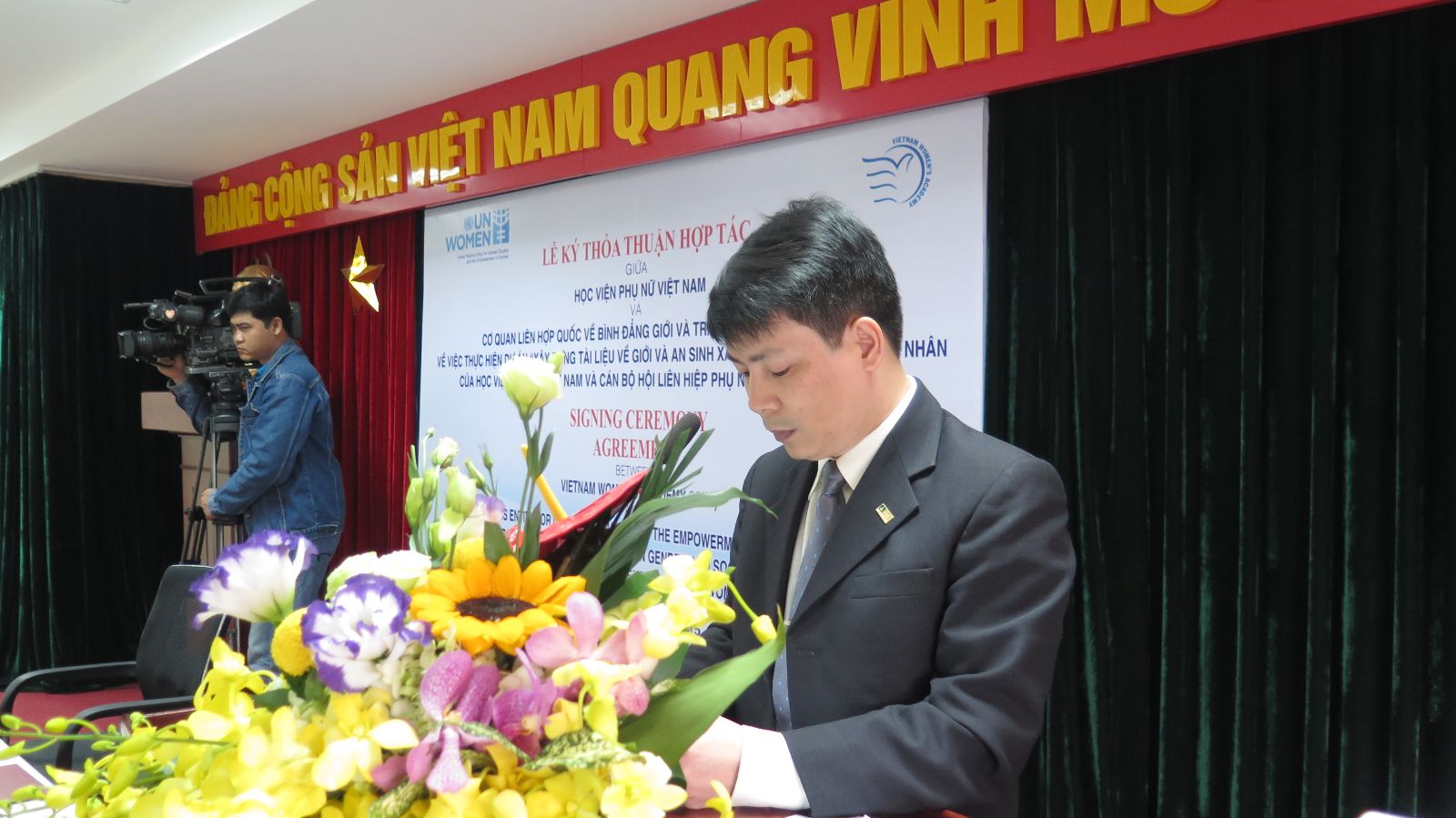 Thay mặt Học viện, Giám đốc trân trọng cảm ơn UN Women đã mang đến một cơ hội hợp tác, giúp đỡ về tài chính và kỹ thuật vô cùng cần thiết và kịp thời, tạo điều kiện cho Học viện sớm hoàn thành bộ tài liệu giảng dạy, học tập đạt chuẩn cho ngành học Giới và Phát triển, nhất là những tài liệu chuyên sâu theo lĩnh vực. Với bộ tài liệu về “Giới và An sinh xã hội”, Học viện sẽ cam kết triển khai đào tạo cho sinh viên đại học chính quy các ngành giới và ngành công tác xã hội (môn học độc lập); lồng ghép vào chương trình bồi dưỡng công tác Hội (dưới dạng các chuyên đề trong các chương trình 1 tháng, 3 tháng) cho cán bộ chủ chốt Hội LHPN cấp cơ sở, bắt đầu từ năm học 2016-2017. TS. Trần Quang Tiến cũng bày tỏ sự tin tưởng rằng thỏa thuận hợp tác tài trợ này của UN Women sẽ góp phần tạo ra những tác động tích cực, cụ thể trong việc lồng ghép giới trong an sinh xã hội cũng như thúc đẩy bình đẳng giới ở Việt Nam.