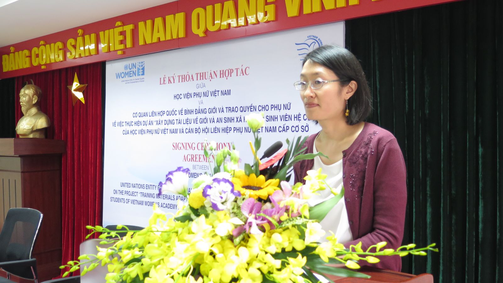 Trưởng đại diện UN Women tại Việt Nam bà Shoko Ishikawa đã phát biểu khẳng định sự nỗ lực của Việt Nam trong việc thúc đẩy bình đẳng giới, được thể hiện bởi sự thông qua các bộ luật mới, đặc biệt là luật về bình đẳng giới và một số bộ luật về bạo lực với phụ nữ. Bà cũng nhấn mạnh ngoài vấn đề bạo lực, bạo hành đối với phụ nữ thì vấn đề nổi trội của Việt Nam hiện nay trong bình đẳng giới là sự mất cân bằng giới khi sinh, thể hiện ở tỉ lệ 113 trẻ em trai/ 110 trẻ em gái. Bà hi vọng và nhắn nhủ với các sinh viên khoa Giới và phát triển của học viện rằng các bạn sẽ đóng vai trò quan trọng trong việc giúp thúc đẩy bình đẳng giới tại Việt Nam. Các bạn sẽ tham gia một phần vào tiến trình này và sẽ là một phần không thể thiếu trong tương lai đối với các hoạt động của cơ quan LHQ cũng như các chương trình của Chính Phủ về thúc đẩy bình đẳng giới tại Việt Nam (ví dụ như thúc đẩy sự tham gia của phụ nữ vào trong Quốc hội, thúc đẩy xây dựng chính sách liên quan đến các vấn đề về Giới…). Các bạn cũng sẽ góp phần vào việc thúc đẩy xây dựng nên các chính sách lồng ghép giới. Việc chọn Học viện Phụ nữ Việt Nam để cùng xây dựng tài liệu về Giới và An sinh xã hội thể hiện mong muốn của UN Women đối với việc thể chế hóa các suy nghĩ tiến bộ về bình đẳng giới vào các khóa học. Bà Shoko Ishikawa mong rằng bộ tài liệu này sẽ được tiếp cận tới hàng trăm sinh viên, để các bạn có thể vận dụng trong công việc tương lai của mình cũng như góp phần tác động đến các cơ quan, tổ chức quan tâm đến vấn đề thúc đẩy bình đẳng giới.