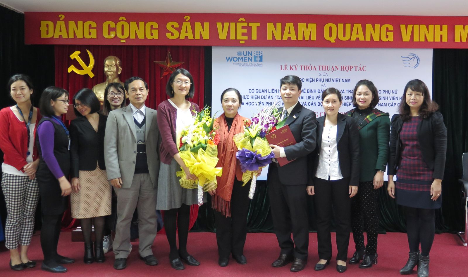 Đại diện Hội LHPN Việt Nam, Phó Chủ tịch Hoàng Thị Ái Nhiên chúc mừng Học viện và UN Women sau quá trình làm việc đã đi đến thỏa thuận ký kết hôm nay. Bà cũng chia sẻ về sự khó khăn, lo lắng của Hội LHPN Việt Nam khi giao cho Học viện đào tạo chuyên ngành Giới và Phát triển hệ cử nhân. Hiện nay, Học viện Phụ nữ Việt Nam là trường duy nhất đào tạo chuyên ngành này. Với sự hỗ trợ của UN Women, sự phối hợp của các cơ quan, tổ chức khác bà tin tưởng rằng sự kiện này sẽ là khởi đầu tốt đẹp cho hành trình hợp tác bền chặt, hiệu quả giữa UN Women đối với Hội LHPN Việt Nam nói chung và Học viện Phụ nữ Việt Nam nói riêng vì mục tiêu chung là sự bình đẳng, tiến bộ của phụ nữ.