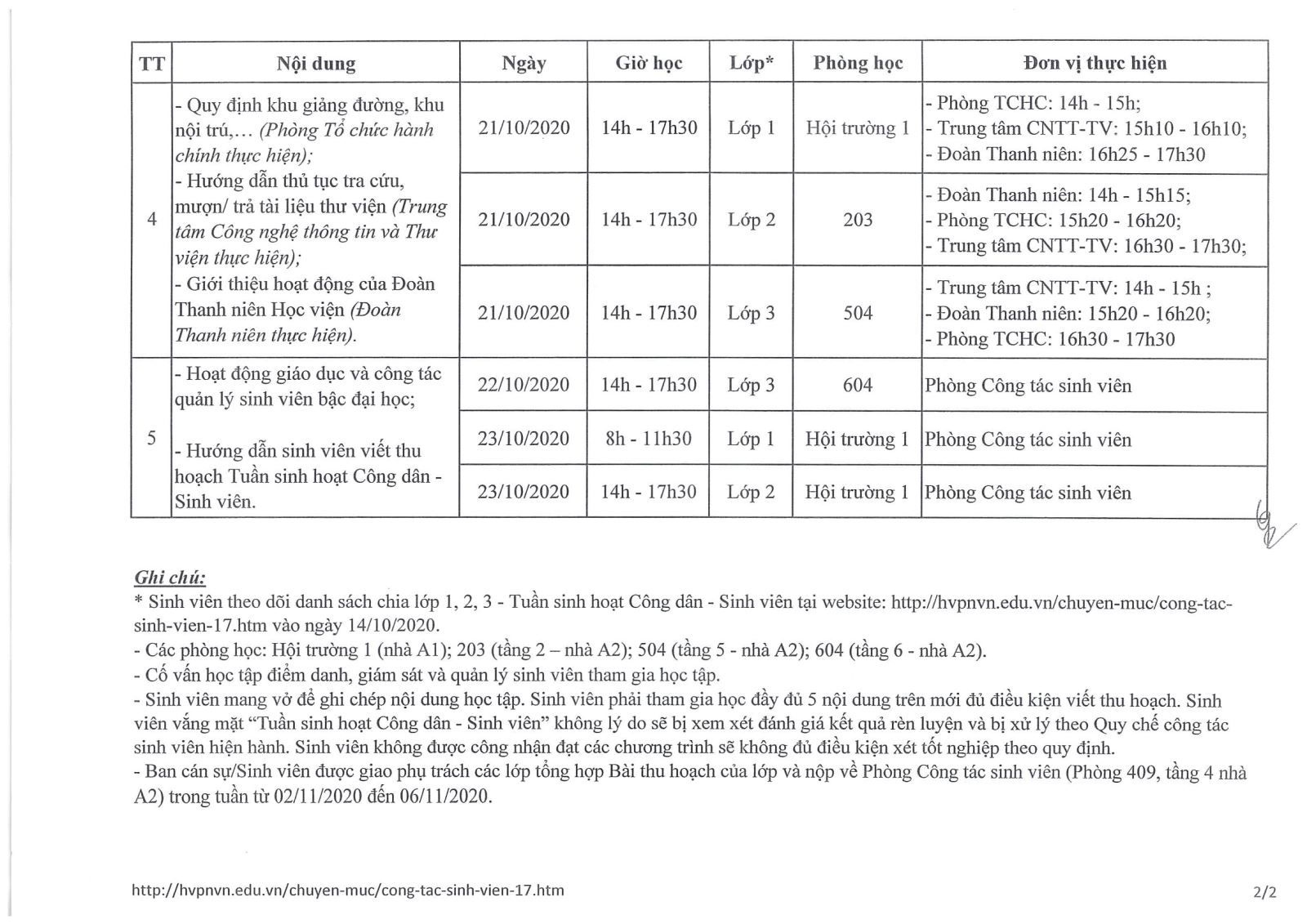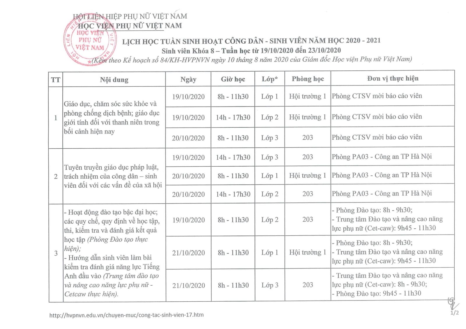 Lịch học tuần công dân – sinh viên khóa 8 năm học 2020 – 2021