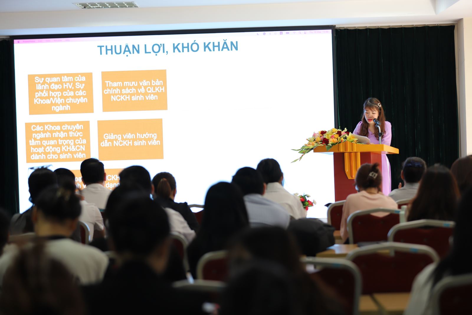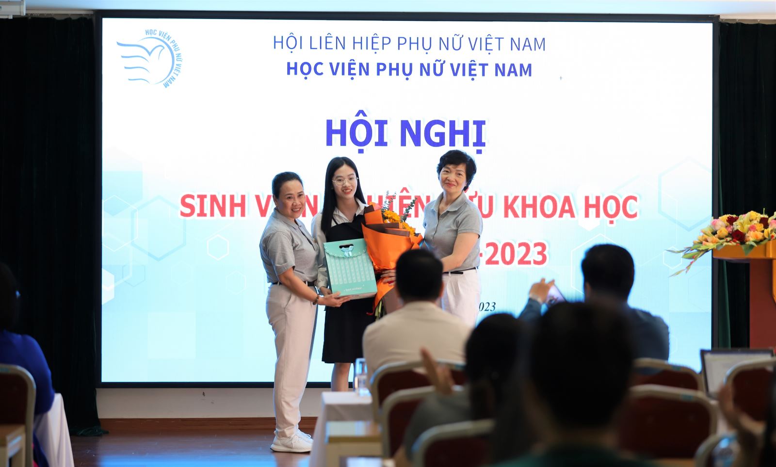 NCS. Nguyễn Phương Chi – Phó Trưởng phòng HTQT và QLKH đã trình bày Báo cáo tổng kết hoạt động NCKH sinh viên năm học 2022-2023 của Học viện Phụ nữ Việt Nam