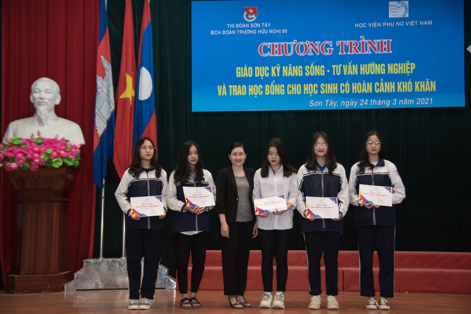 Trường Hữu Nghị 80 nằm cách thủ đô Hà Nội 42km, là mái trường thể hiện tinh thần hữu nghị, hợp tác của ba nước anh em Việt Nam – Lào – Campuchia và cũng là mái trường của các em học sinh đến từ hơn 20 dân tộc thiểu số và vùng núi hải đảo xa xôi. Thấu hiểu những khó khăn của các em học sinh tại đây, Học viện Phụ nữ Việt Nam đã trao 06 suất học bổng cho 06 em học sinh có hoàn cảnh khó khăn vươn lên trong học tập, và 05 voucher tài trợ học phí cho các em học sinh trúng tuyển và theo học tại Học viện năm học 2021 – 2022.