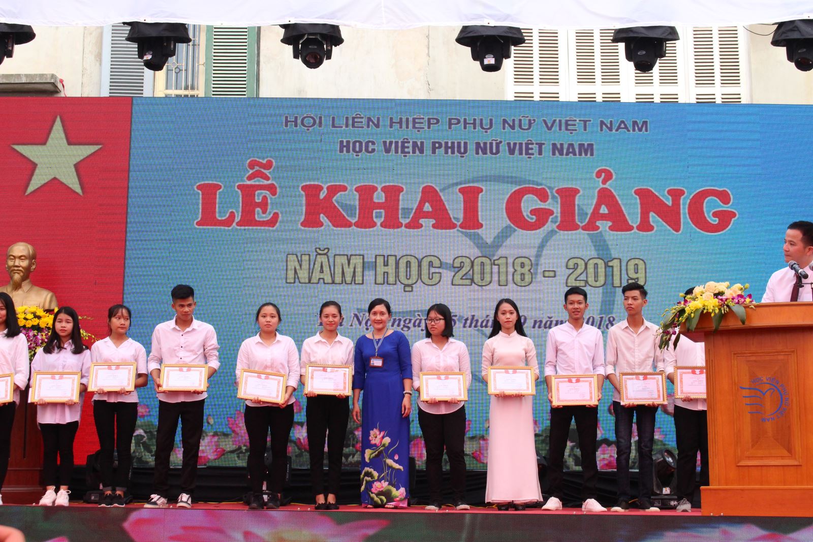 Phó Giám đốc học viện Hà Thị Thanh Vân trao học bổng và tặng hoa chúc mừng các tân sinh viên đạt điểm cao trong kỳ thi tốt nghiệp PTTH Quốc gia