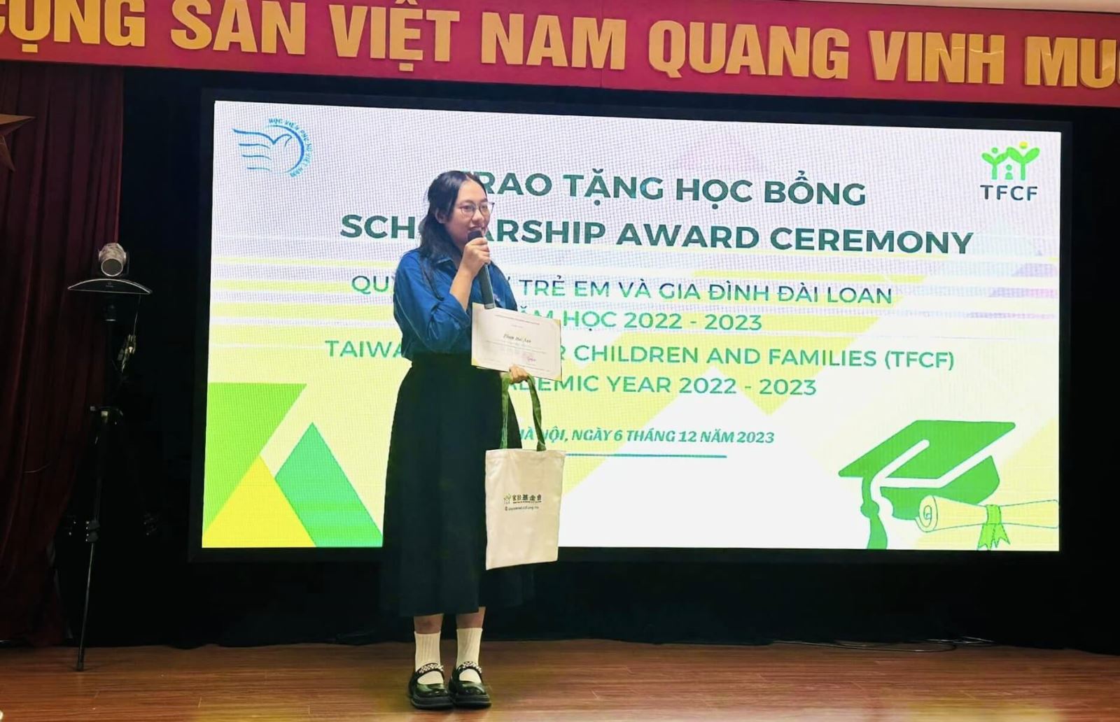 Cũng trong buổi sáng cùng ngày, nhân dịp sự kiện Tổng kết công tác Đoàn Thanh niên Học viện năm 2023, tổ chức TFCF đã trao 02 suất học bổng với tổng trị giá 15 triệu đồng cho 02 sinh viên: Đỗ Thị Hồng Tươi – Ngành CTXH và Phạm Hải Anh – Song ngành Luật và Giới.