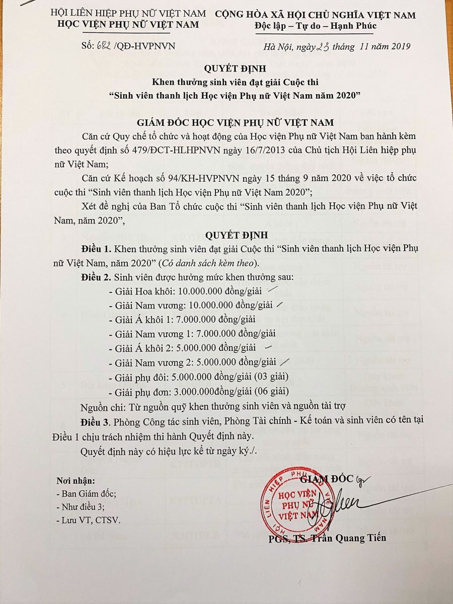 Quyết định khen thưởng Sinh viên đạt giải cuộc thi Sinh viên thanh lịch năm 2020