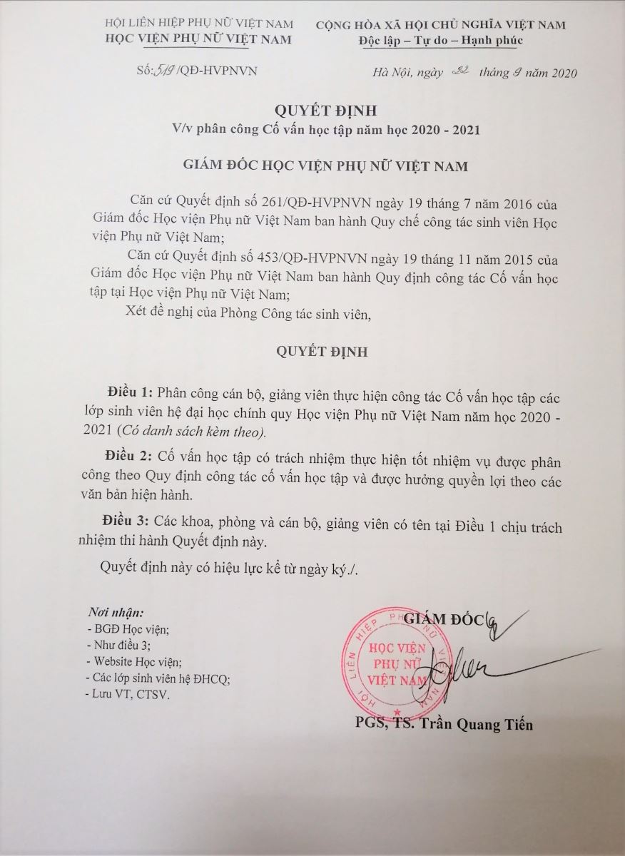 Quyết định Phân công cố vấn học tập năm học 2020 – 2021