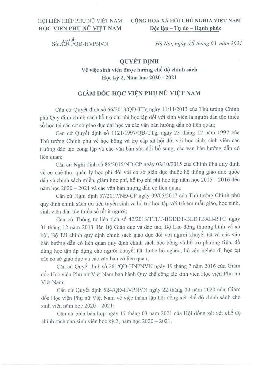 Quyết định về việc sinh viên được hưởng chế độ chính sách HK2, 2020 – 2021