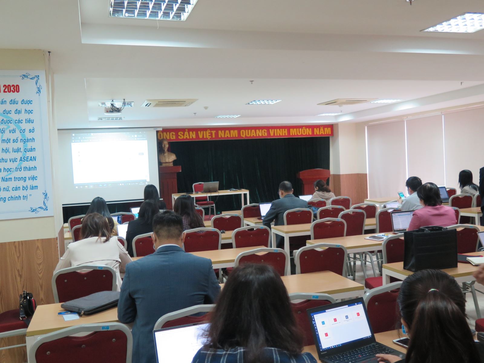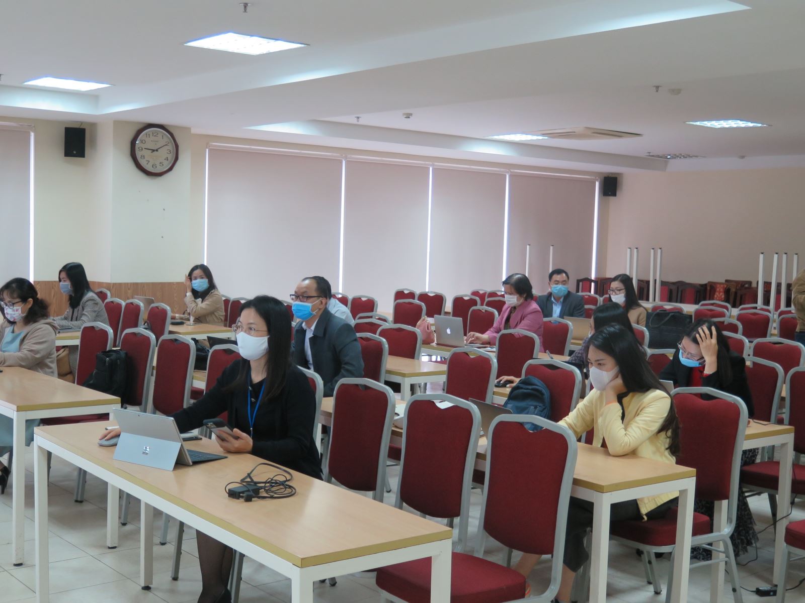 Khi tham gia khóa tập huấn, các cán bộ, giảng viên cũng chủ động thực hiện nghiêm túc các biện pháp phòng, chống dịch Covid – 19 như rửa tay sát khuẩn trước khi vào phòng học; Đeo khẩu trang trong quá trình tập huấn; Ngồi giãn cách đúng yêu cầu; Rửa tay sát khuẩn …