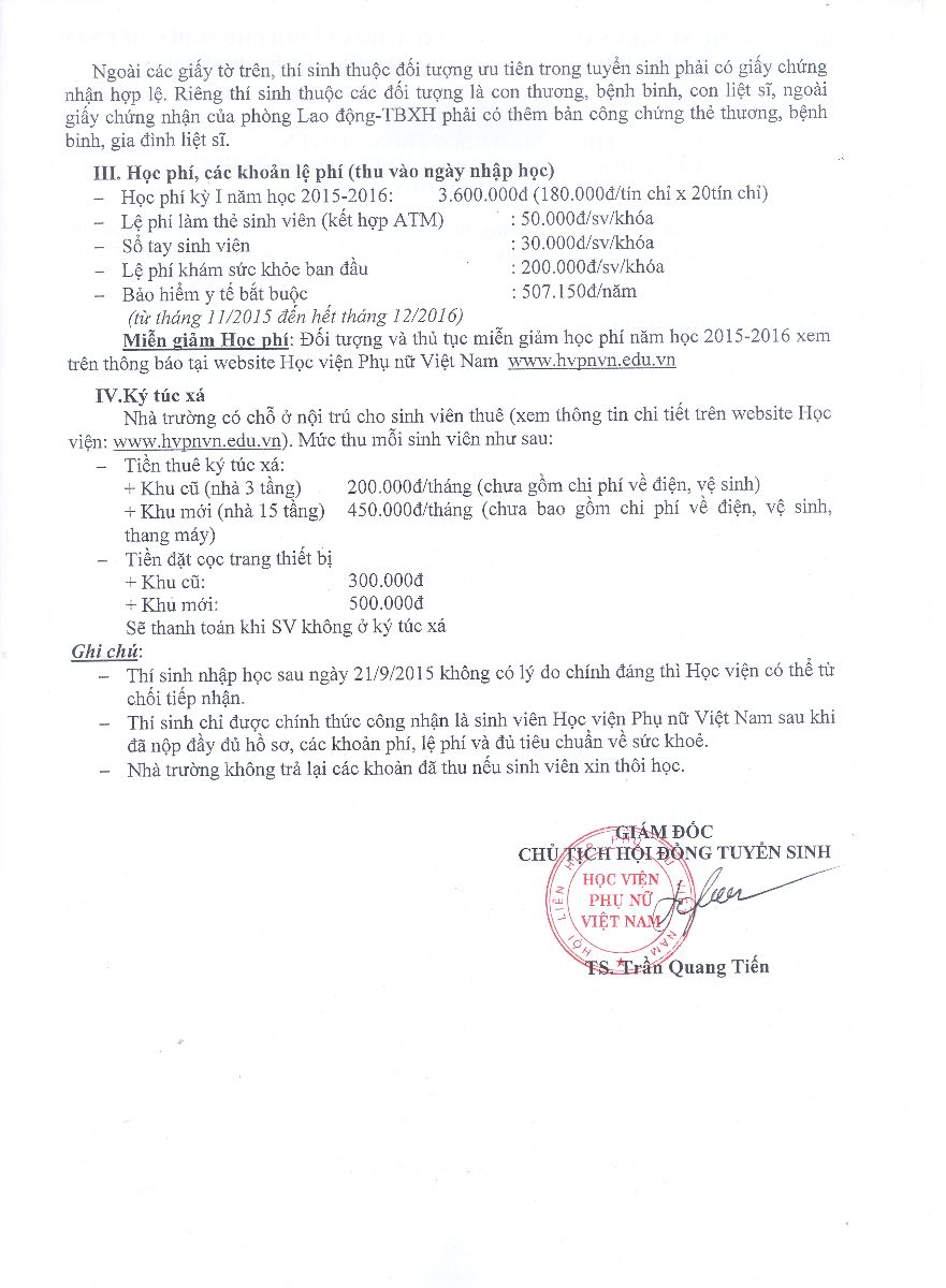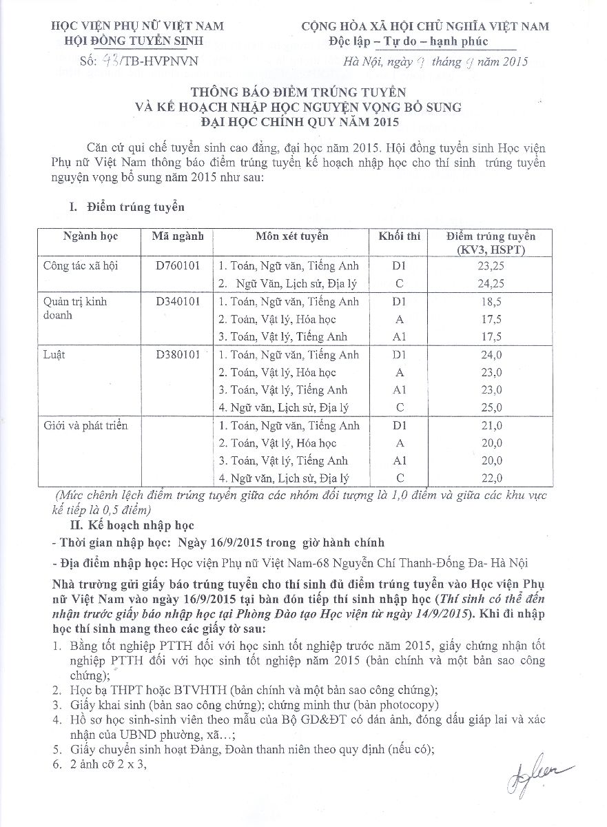 THÔNG BÁO ĐIỂM TRÚNG TUYỂN VÀ KẾ HOẠCH NHẬP HỌC NVBS 2015