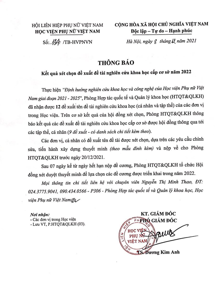 Thông báo kết quả xét duyệt đề xuất đề tài NCKH năm 2022