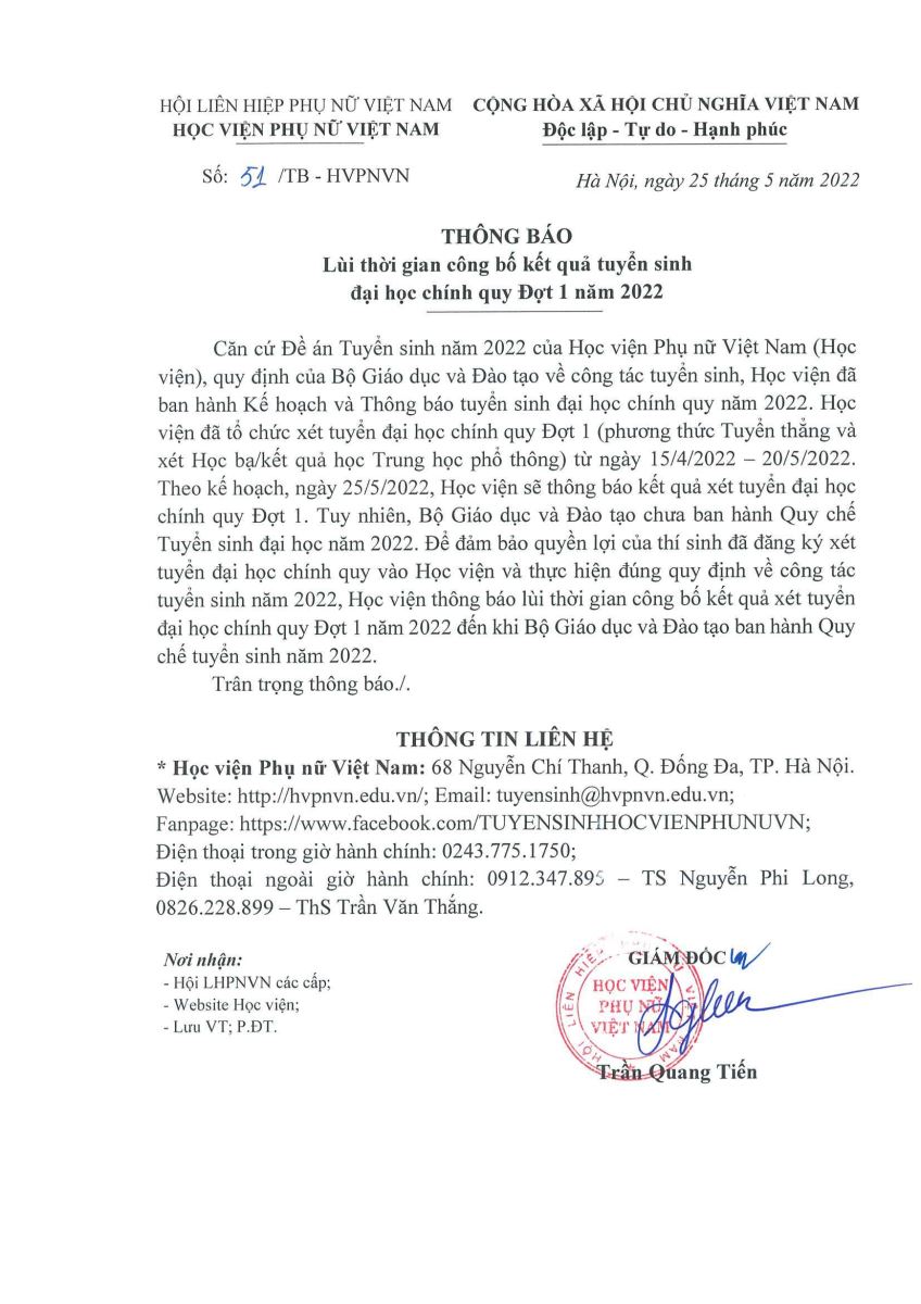 THÔNG BÁO LÙI THỜI GIAN CÔNG BỐ KẾT QUẢ XÉT TUYỂN ĐỢT 1, 2022