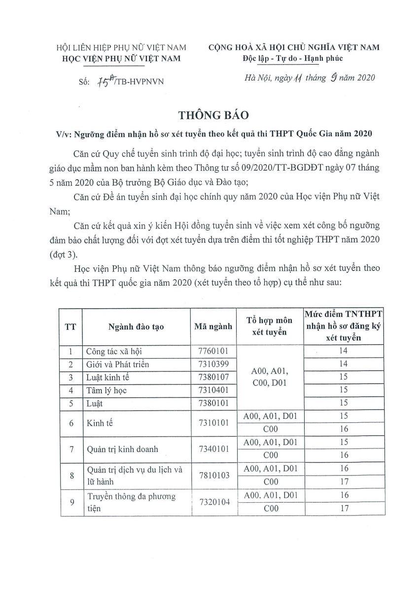 THÔNG BÁO NGƯỠNG ĐIỂM NHẬN HỒ SƠ XÉT TUYỂN ĐH 2020