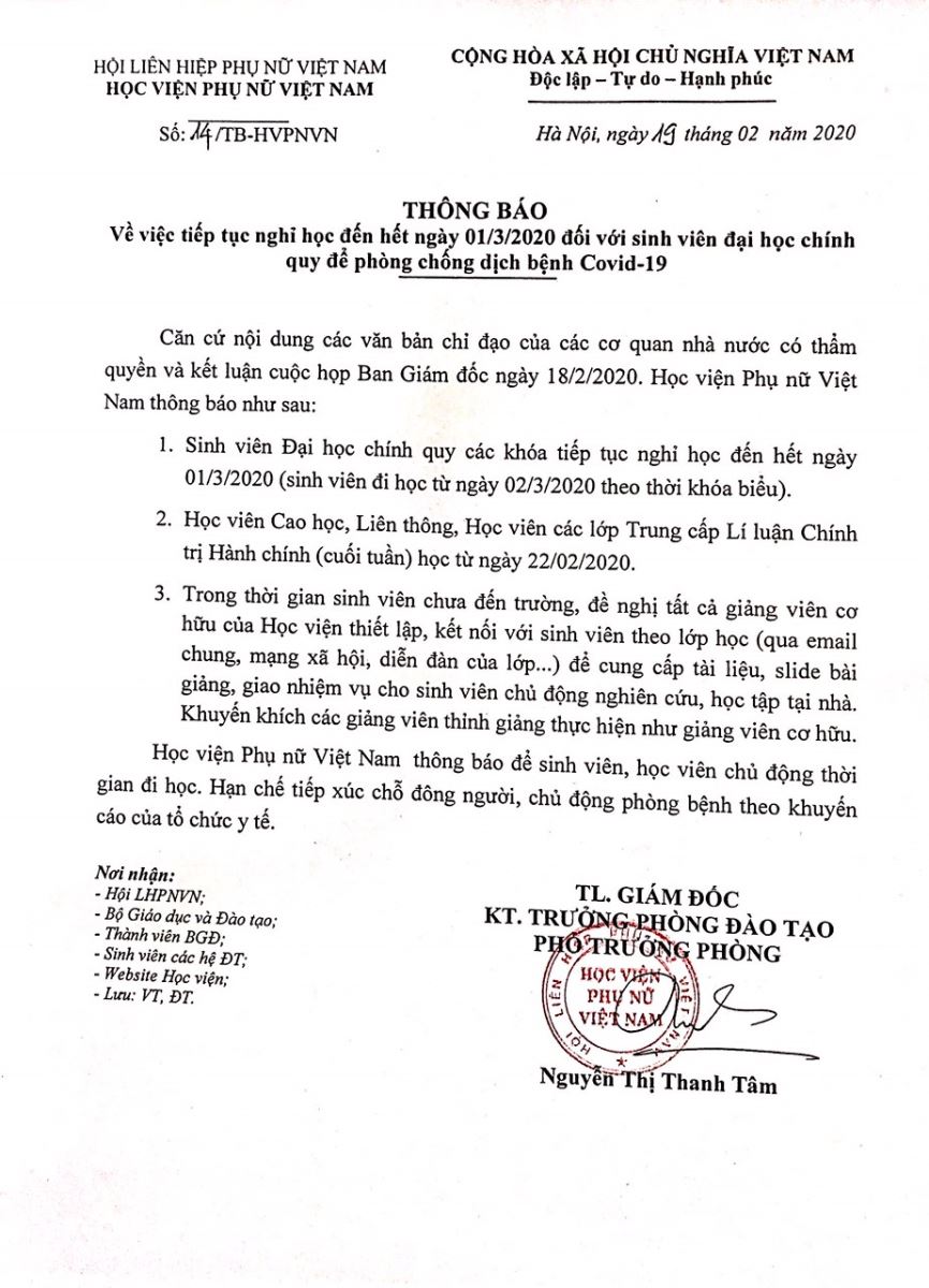 Tin tứcThông báo: Sinh viên nghỉ học đến hết ngày 1/3/2020 Posted on Tháng Hai 21, 2020 by admin(full) 21 Th2 admin(full) THÔNG BÁO TIẾP TỤC NGHỈ HỌC ĐẾN HẾT NGÀY 23/2/2020 Thông báo về việc bắt đầu học tập học kỳ II năm học 2019 – 2020