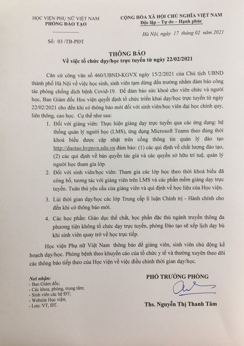 Thông báo tổ chức dạy/học trực tuyến từ ngày 22/02/2021