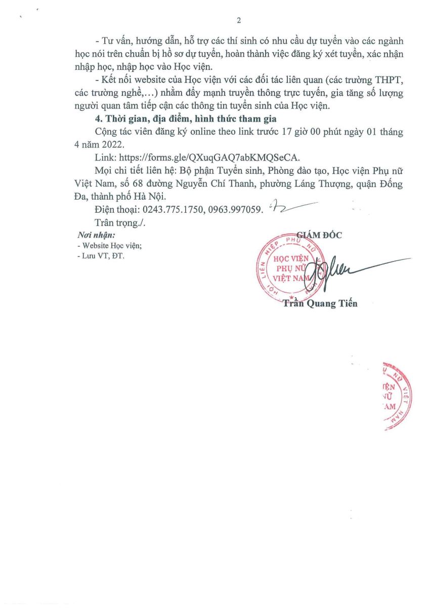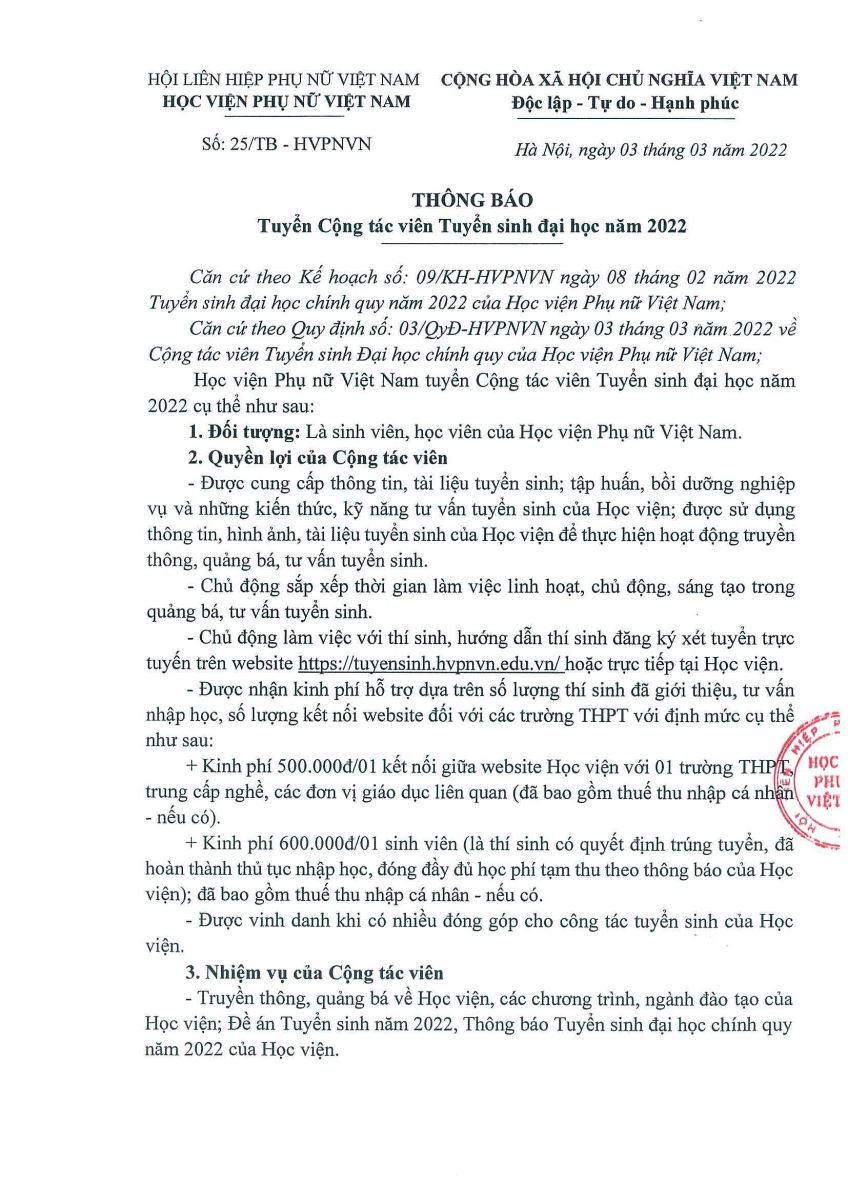 Tin tứcThông báo tuyển cộng tác viên tuyển sinh năm 2022 Posted on Tháng Ba 7, 2022 by admin(full) 07 Th3 ĐĂNG KÝ TRỞ THÀNH CỘNG TÁC VIÊN TUYỂN SINH TẠI ĐÂY admin(full) Kế hoạch thi lại, thi cải thiện điểm HKI năm học 2021 – 2022 Cơ hội nhận học bổng, ưu đãi tại Học viện Phụ nữ Việt Nam