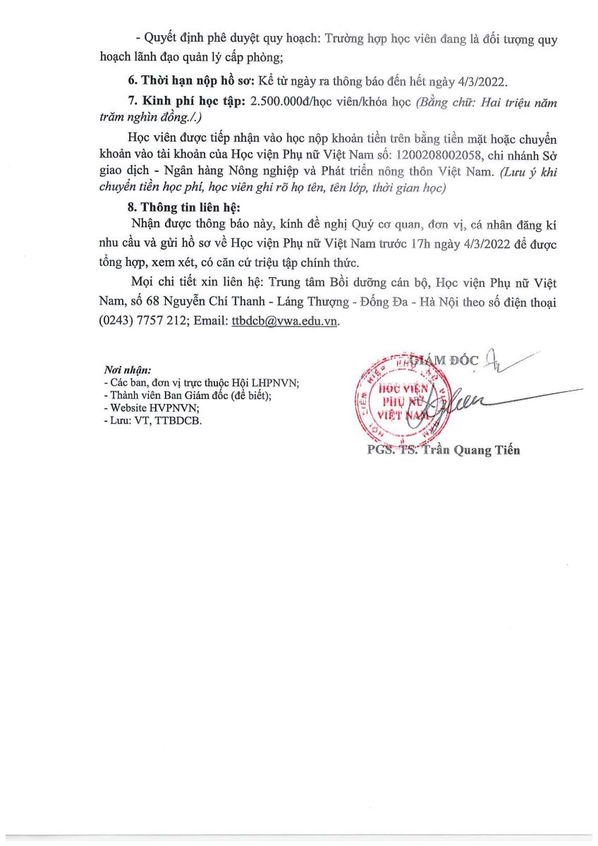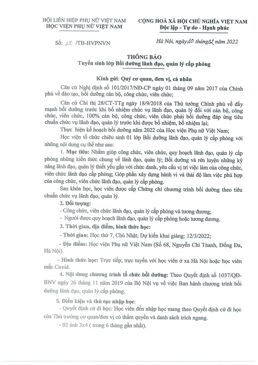 Thông báo tuyển sinh lớp bồi dưỡng lãnh đạo, quản lý cấp phòng