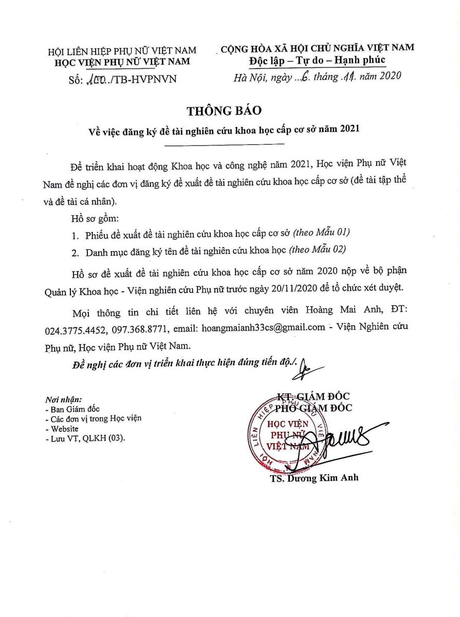 Thông báo về việc đăng ký đề tài NCKH cấp cơ sở năm 2021