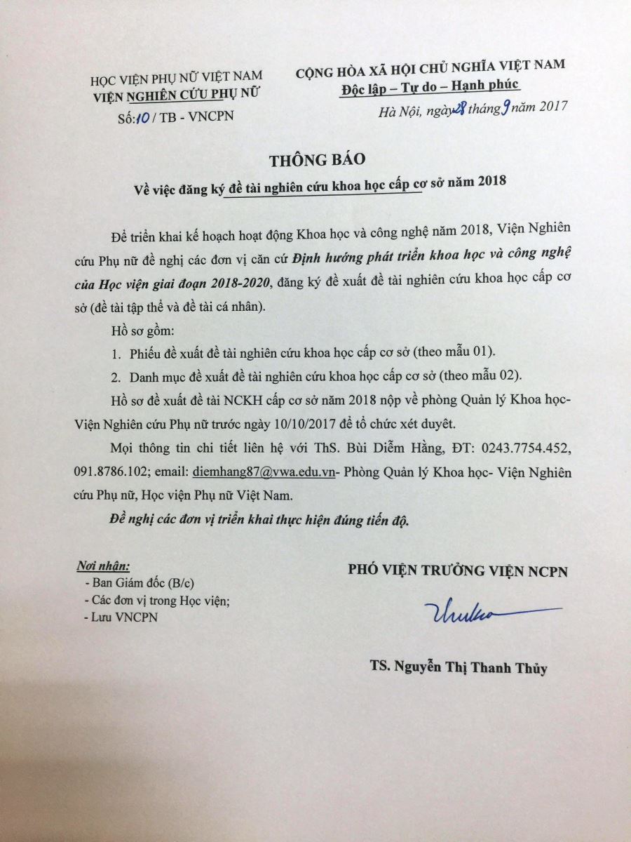 Thông báo về việc đăng ký đề tài nghiên cứu khoa học cấp cơ sở năm 2018