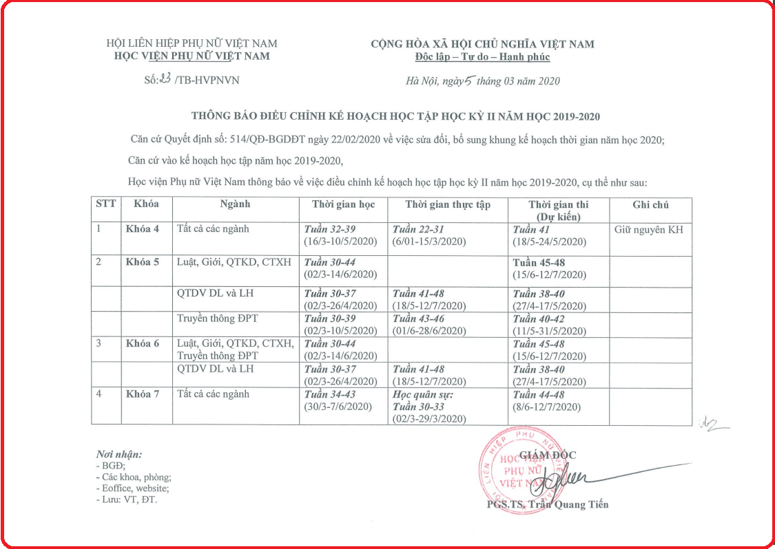 Tin tứcThông báo về việc điều chỉnh kế hoạch học tập HK 2 năm học 2019 – 2020 Posted on Tháng Ba 6, 2020 by admin(full) 06 Th3 admin(full) Tập huấn chính sách bảo vệ trẻ em Học viện Phụ nữ Việt Nam hưởng ứng tuần lễ Áo dài