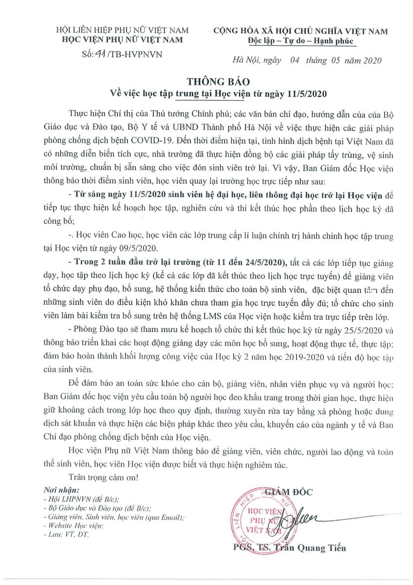 Thông báo về việc học tập trung tại Học viện từ ngày 11/5