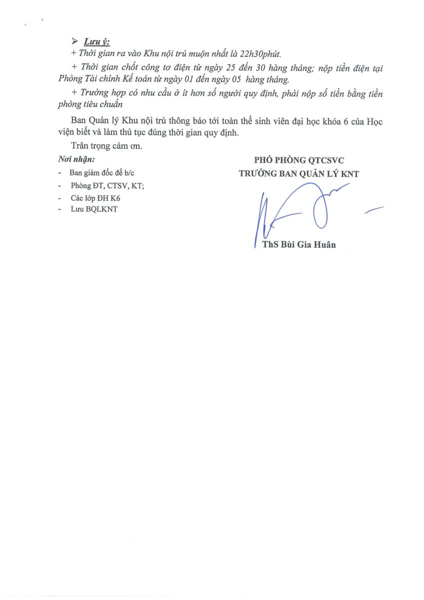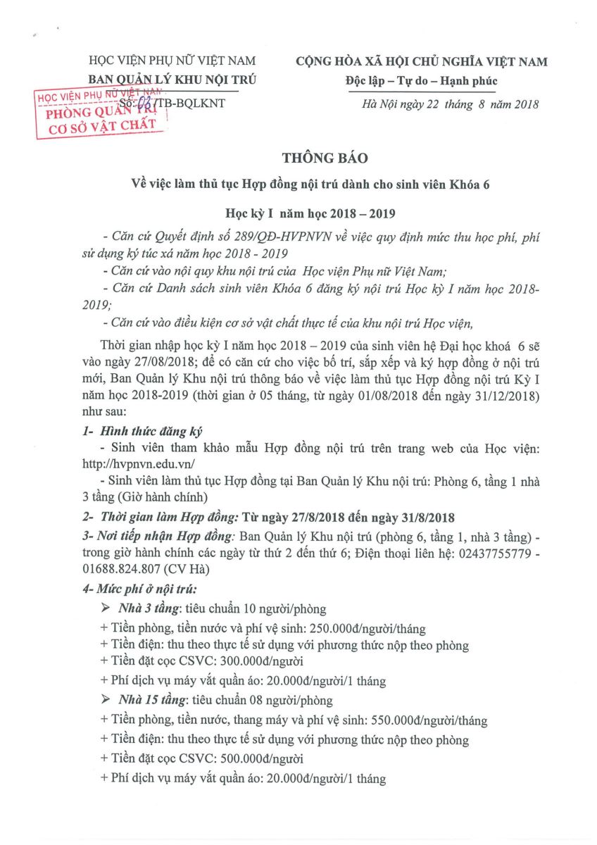 Thông báo về việc làm thủ tục hợp đồng ở Nội trú dành cho K6