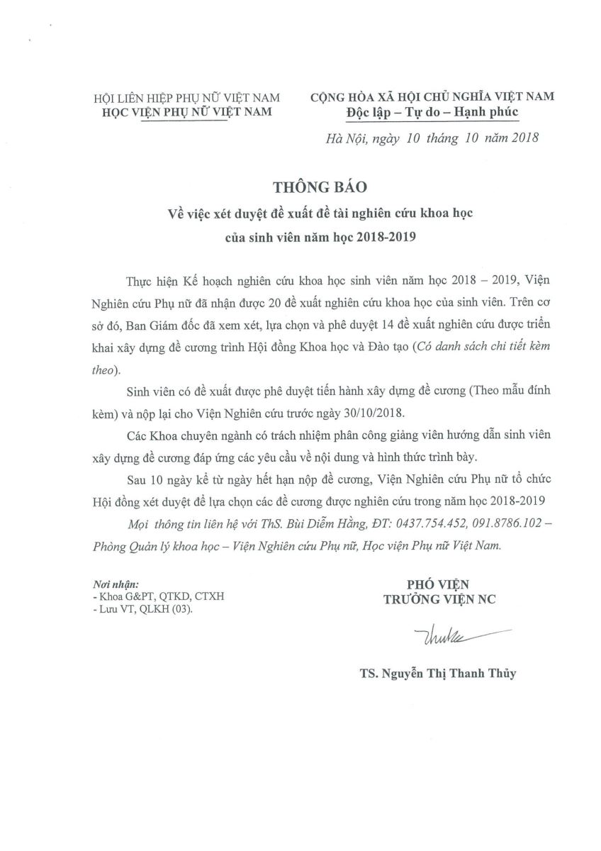 Thông báo về việc xét duyệt đề tài NCKH sinh viên năm 2018 – 2019