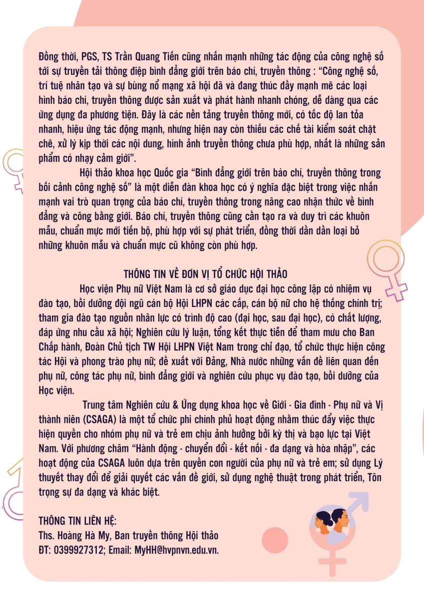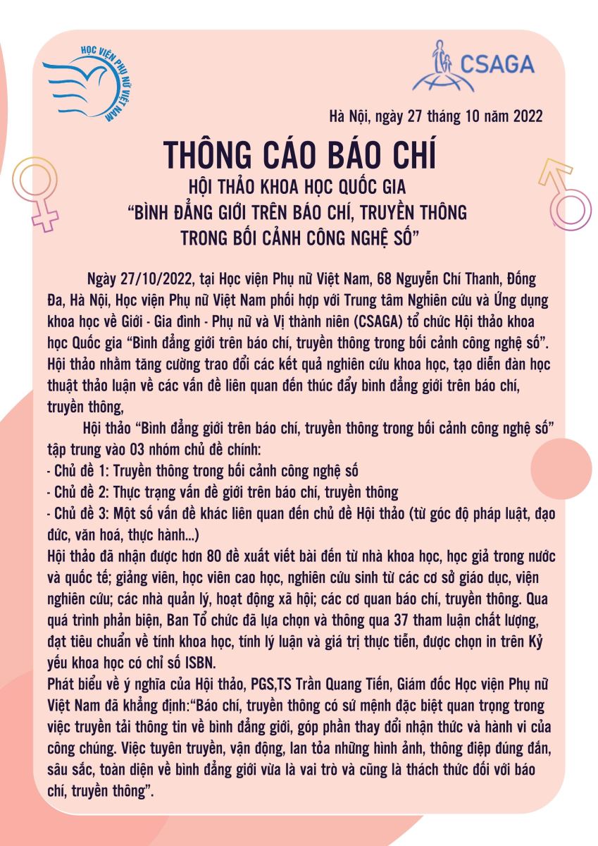 Tin tứcThông cáo báo chí HT khoa học Quốc gia: “Bình đẳng giới trên báo chí truyền thông trong bối cảnh công nghệ số” Posted on Tháng Mười 26, 2022 by admin(full) 26 Th10 admin(full) Đội ngũ giảng viên Học viện Phụ nữ Việt Nam Phát biểu khai mạc hội thảo: “Bình đẳng giới trên báo chí, truyền thông trong bối cảnh công nghệ số”