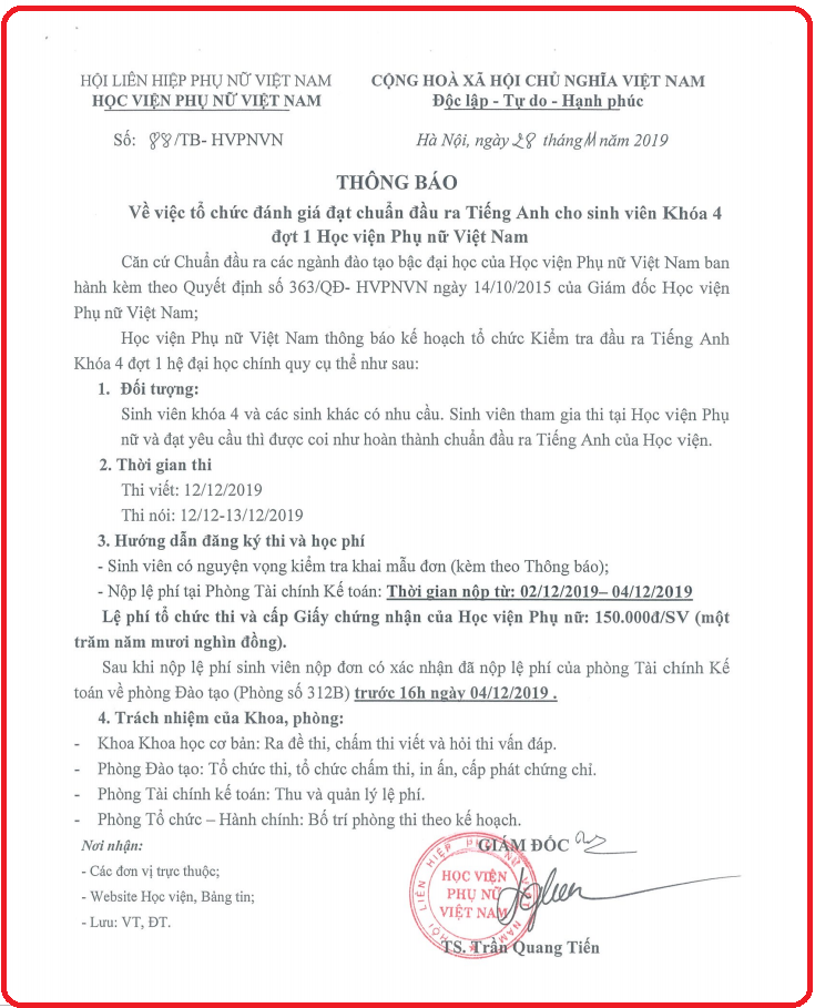 Tin tứcTổ chức đánh giá đạt chuẩn đầu ra Tiếng Anh cho SV khóa 4 đợt I Posted on Tháng Mười Một 28, 2019 by admin(full) 28 Th11 MẪU ĐƠN ĐĂNG KÝ KIỂM TRA TIẾNG ANH CHUẨN ĐẦU RA admin(full) Khai mạc Hội thao sinh viên Học viện Phụ nữ Việt Nam năm 2019 Hội nghị công chức, viên chức, người lao động năm 2019
