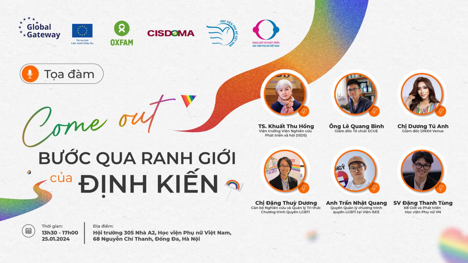 Sự kiện là một trong nhiều hoạt động hợp tác giữa Học viện Phụ nữ Việt Nam với Viện Tư vấn Phát triển Kinh tế Xã hội Nông thôn và Miền núi (CISDOMA) trong khuôn khổ Dự án “Thanh niên tham gia thay đổi định kiến giới, thúc đẩy bình đẳng giới tại Việt Nam” do Tổ chức Oxfam và Liên minh Châu Âu tài trợ. Khoa Giới và Phát triển, Học viện Phụ nữ Việt Nam đầu mối tổ chức Toạ đàm “Come out – Bước qua ranh giới của định kiến”.
